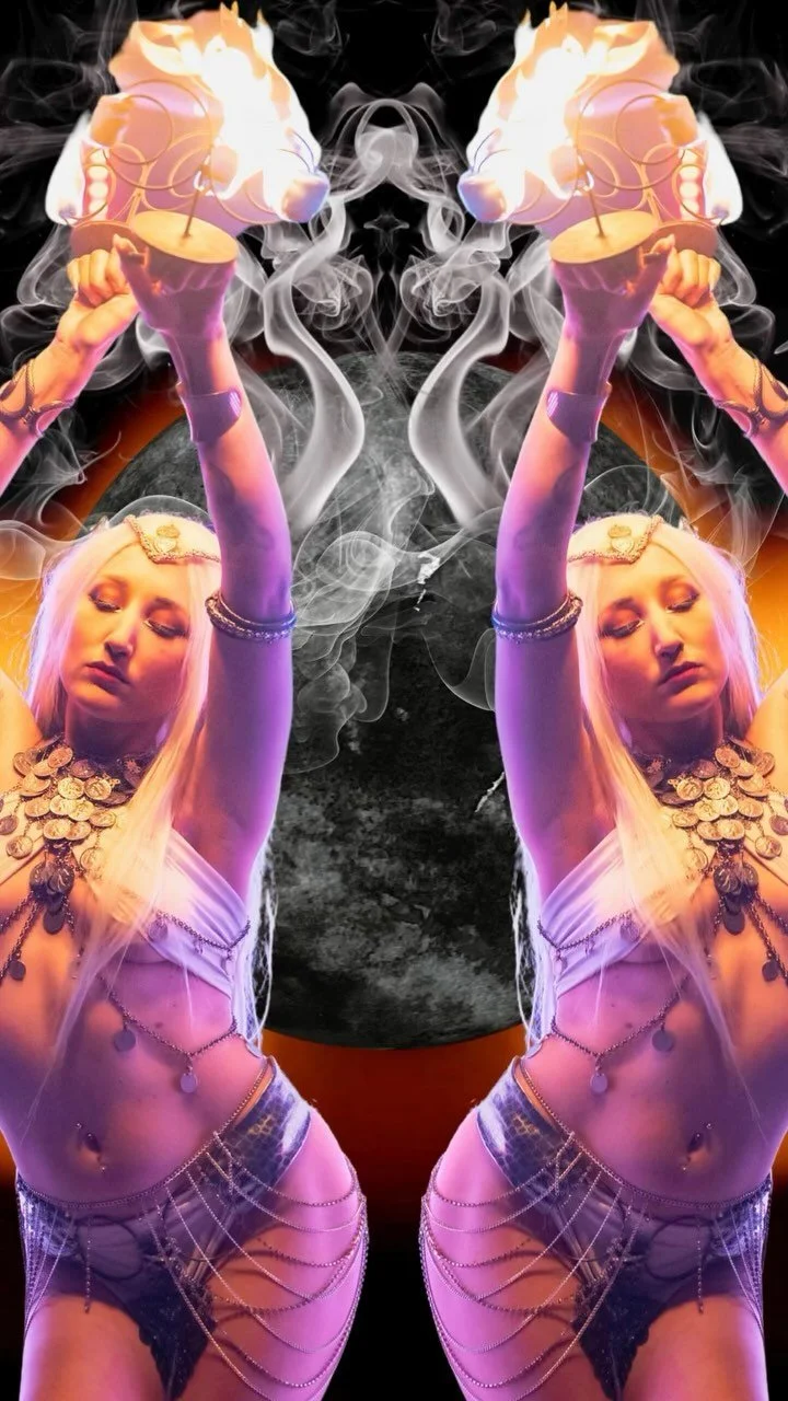 A performer with platinum blonde braided hair and spikes on her head, wearing a sequined top, is performing a fire-breathing act with flames coming from her mouth.